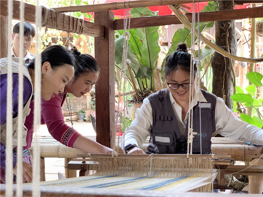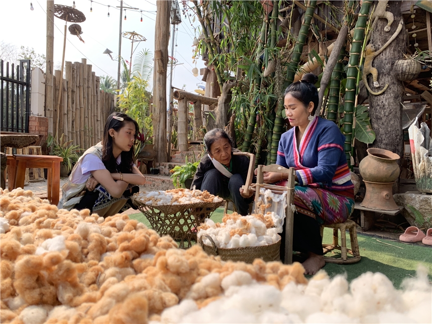 活動現場,她們親身體驗了老撾傳統手工編織技藝。在手藝人的指導下,從采摘棉花開始,逐步完成壓平、卷軸成絲線、編織成布等工序,感受老撾傳統工藝的精妙。