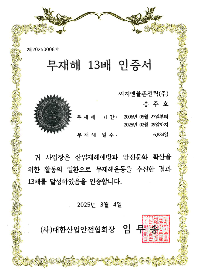 3月26日,根據評估結果,韓國產業安全協會KISA(Korea Industrial Safety Association)向栗村電廠頒發連續13輪6834天無事故記錄認證證書。