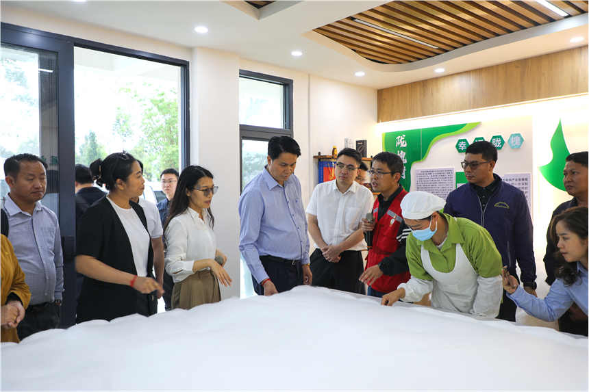 ▲考察團在凌云縣桑蠶產業幫扶項目現場參觀蠶絲被